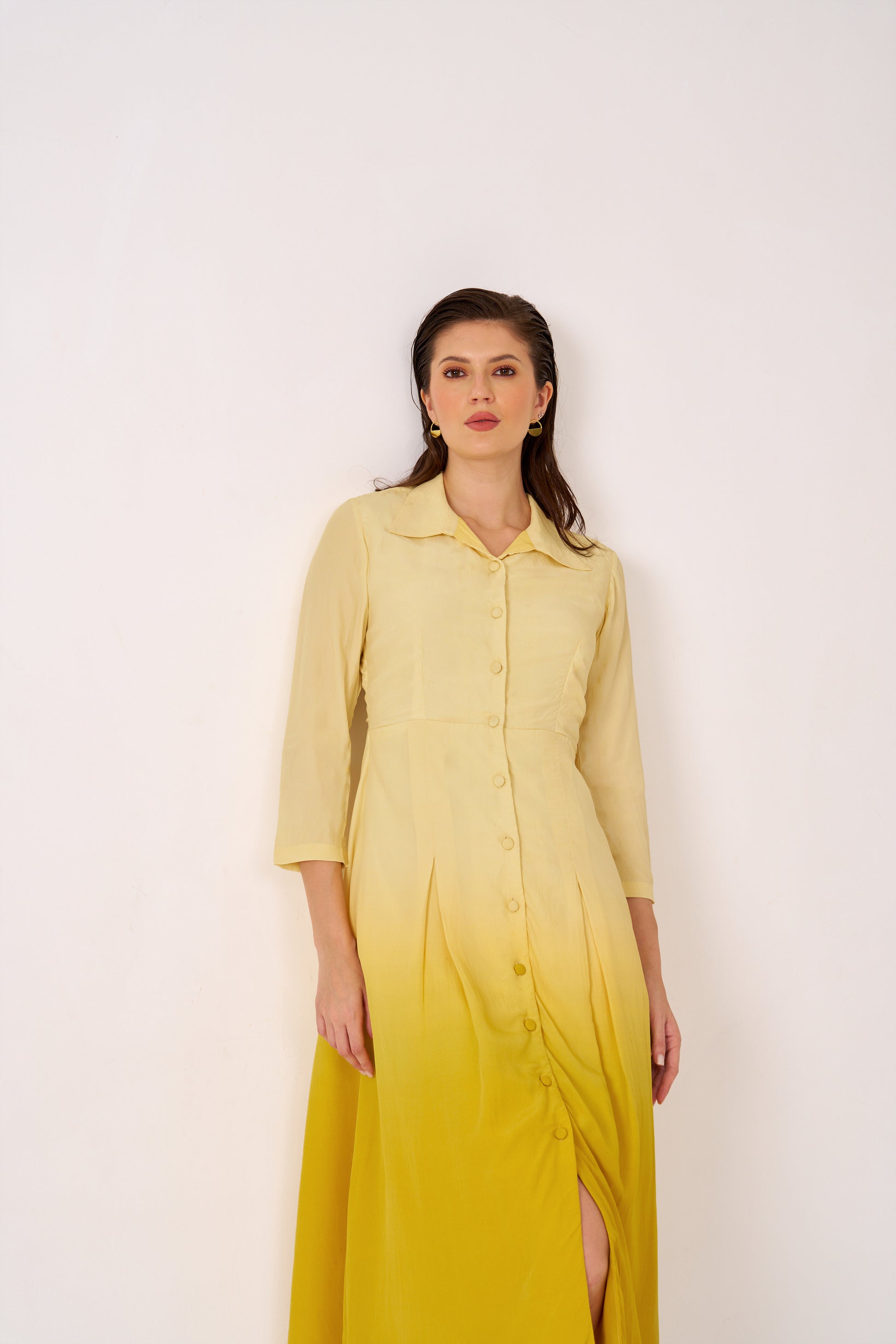 Bright, breezy, and beautifully tailored—the Faye Dress brings a dose of sunshine to your wardrobe. Crafted in crepe with a soft ombré fade from lemon to marigold, it features a button-down front, gentle pleating at the waist, and a clean collar neckline. Designed to carry you from desk to drinks with effortless charm.