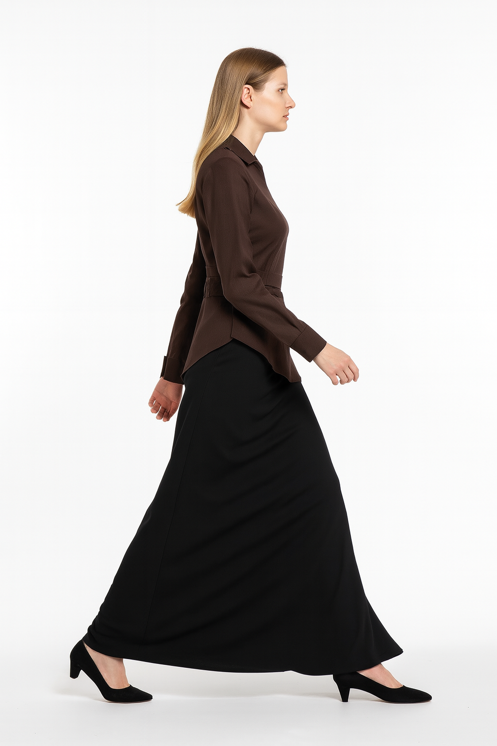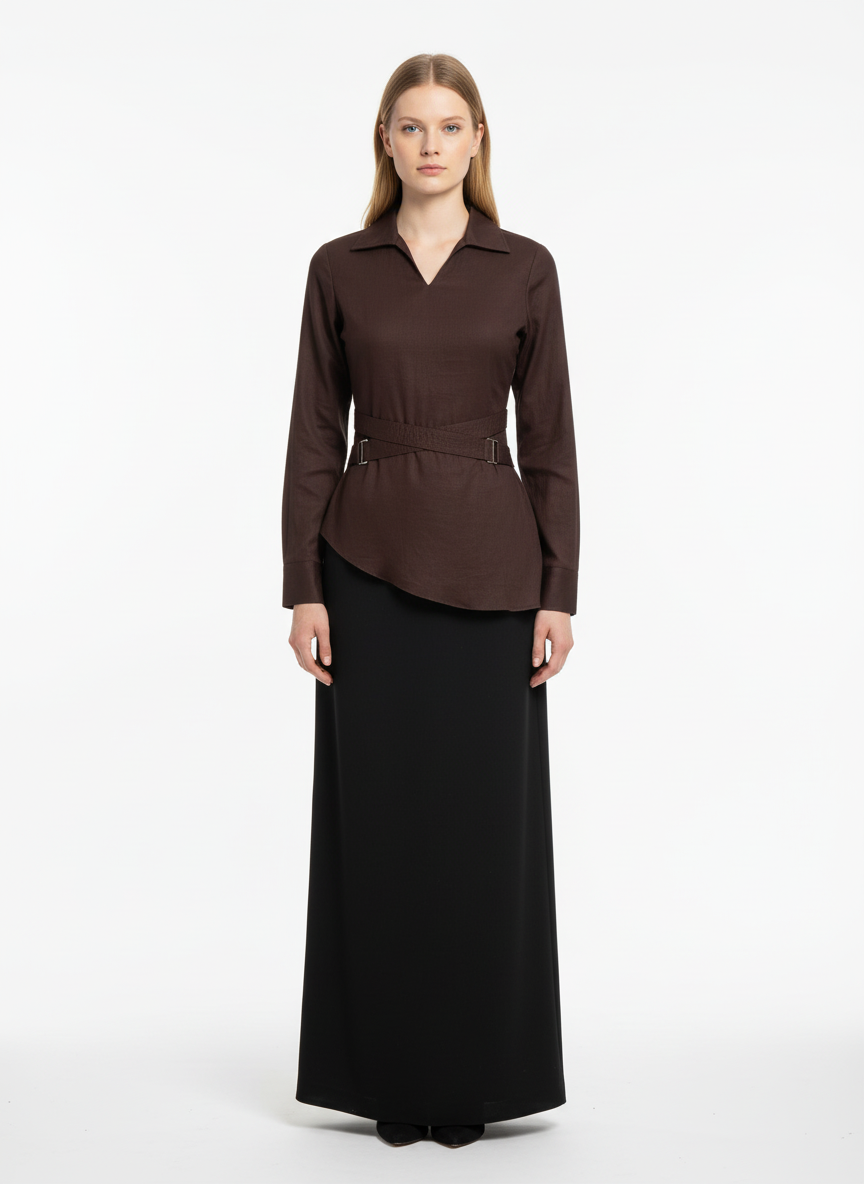 The Maze Set is built around structure, balance, and quiet authority. The cotton twill shirt features a sharp collar, asymmetric hem, and a cross-belt detail that defines the waist with intention. Paired with a fit-and-flare polyester suiting skirt, the set creates a controlled silhouette that opens up softly toward the hem.